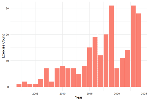 Figure 1: Total Chinese Combined Exercises, 2001–2024 (figures to the left of the dashed line are from Bernhardt’s 2021 dataset, while figures to the right are from data compiled by the authors)