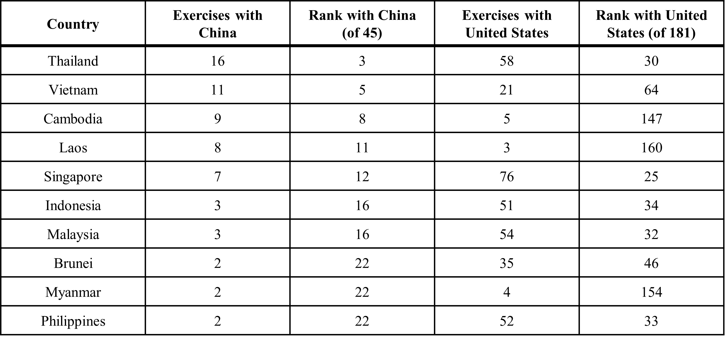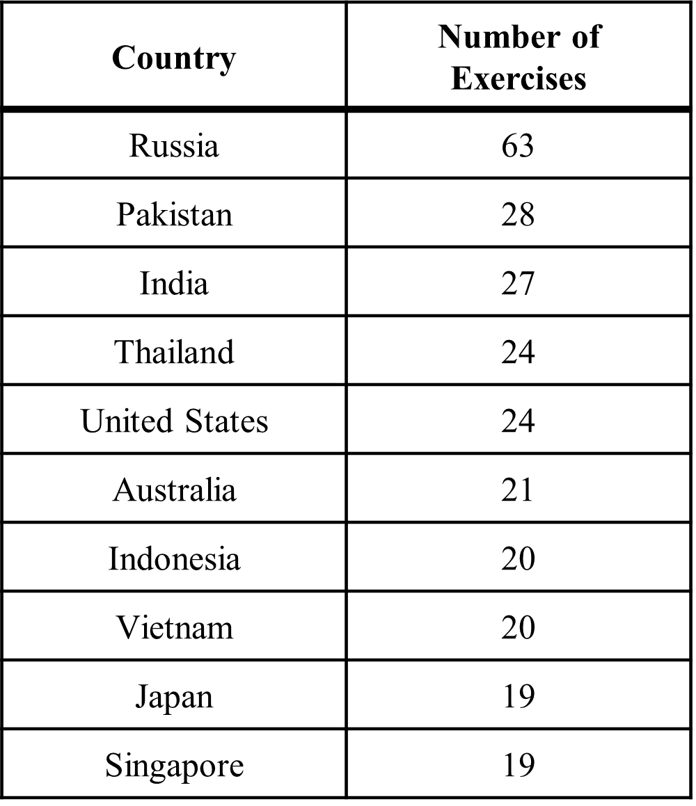 Interestingly, China participated in twenty-four exercises with the United States, enough to tie for fourth among China’s overall exercise partners. Considering the strategic rivalry between these two states, this is very unexpected. There are two explanations: historical US integration efforts and participation in non-combat-oriented exercises.
