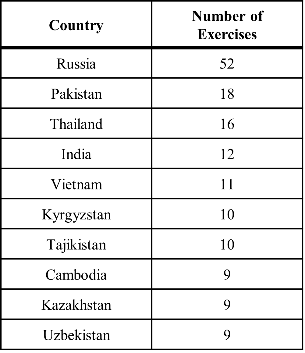 While China has made gains in the raw number of exercises its forces participate in, the scope of countries that they integrate with is still relatively limited compared to the breadth of partners the United States works with. Table 1 shows the top ten most frequent participants of exercises with China between 2017 and 2024. Russia is China’s most frequent exercise partner with sixty-three combined exercises conducted during this period. China’s two other most populous SCO partners, Pakistan and India, follow in second and third place, with Thailand occupying fourth.