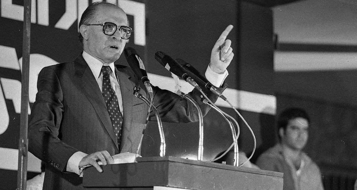 Image: Israeli Prime Minister Menachem Begin speaks during press conference following attack on Iraqi nuclear facility, June 11, 1981 (Credit: Dan Hadani Collection, National Library of Israel)