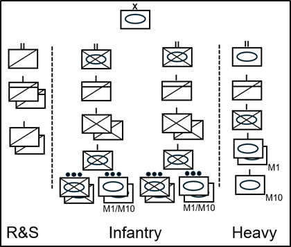 The two infantry battalions would be equipped with ISVs, Bradleys, Abrams, and Bookers to provide them with the right of amount of infantry and armor to fight in various forms of restrictive terrain. Like the R&S squadron, each infantry battalion would have robots to sense and vehicles to ensure it can rapidly disperse and mass based on conditions. The battalion’s armor company consists of a mix of Bradley, Abrams, and Booker vehicles that can reinforce attacking infantry, defend against armor, or go on the offensive when conditions are set. With only one mechanized company, the fuel requirement would be significantly less than the traditional combined arms battalion.