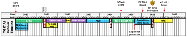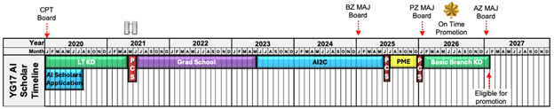 The AI Scholars program consumes four years by itself: two in school and two in utilization. Add PME and KD, and you now have five and a half years (minimum) of mandatory milestones crammed into a four-and-a-half-year window, and this does not account for geographic moves, administrative delays, course availability, or the inevitable dead time in real units—spent waiting for or transitioning into KD assignments.