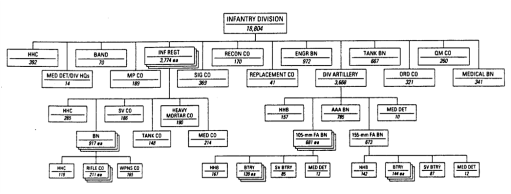 During World War II, division and corps commanders believed the triangular division was too streamlined and lacked important capabilities. The 1948 reorganization added an organic tank battalion and antiaircraft artillery battalion to the division as well as an organic tank company for each infantry regiment. This codified what were habitually attached capabilities from higher headquarters during World War II. It also added more engineers, military police, maintenance, quartermaster, communications, intelligence, reconnaissance, and administrative soldiers seen as necessary to operate on the larger battlefields created by motorized formations. Artillery batteries increased from four guns to six, increasing the division’s artillery firepower by 50 percent without increasing overhead staffs. These additions resulted in an end strength of 18,804. Planners made these changes based on lessons learned from combat.