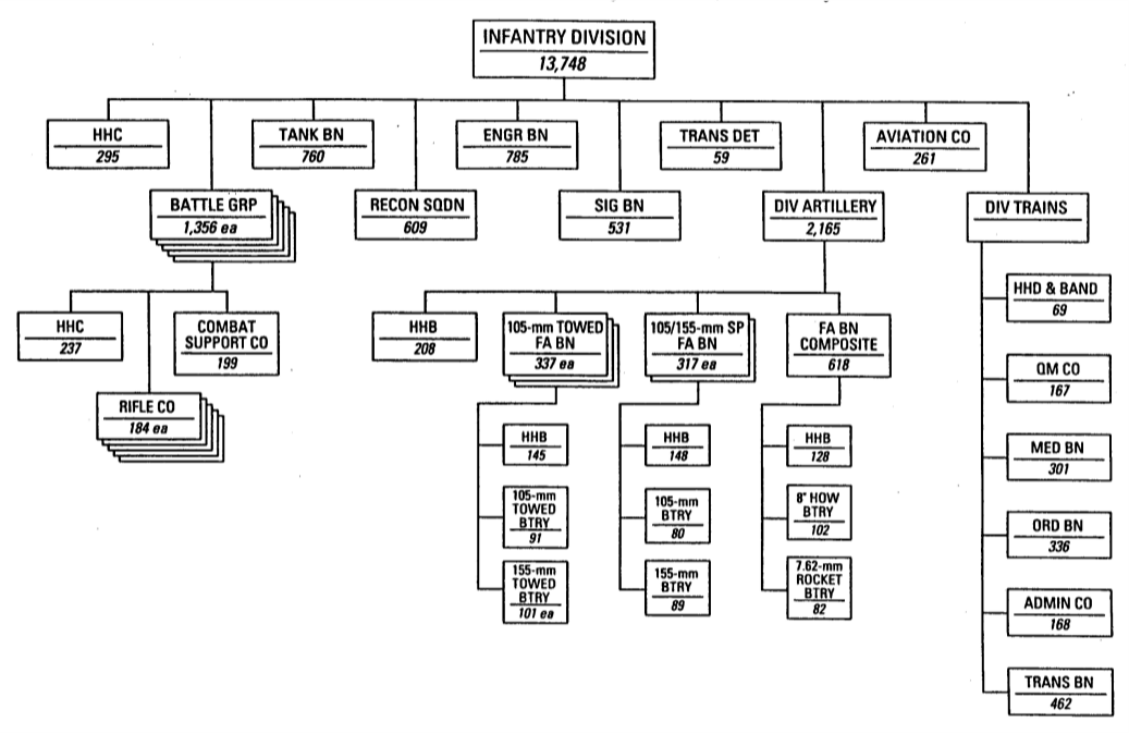 The new Reorganization Objective Army Division (ROAD) initiative envisioned an infantry division designed to operate against heavy conventional Soviet forces in Europe or against communist insurgents on the periphery. Infantry, mechanized infantry, and armored division designs were standardized. Infantry divisions had eight mechanized and two tank battalions, mechanized divisions had seven mechanized and three tank battalions, and armored divisions had five mechanized and six tank battalions. The division consisted of “a military police company; aviation, engineer, and signal battalions; a reconnaissance squadron with an air and three ground troops; division artillery; and a support command.” The division operated from three command posts and had two assistant commanders to expand the division commander’s span of control. The division support command was a new concept that also helped increase the division commander’s span of control by delegating supply, maintenance, medical services, and rear area security responsibilities to the support commander.