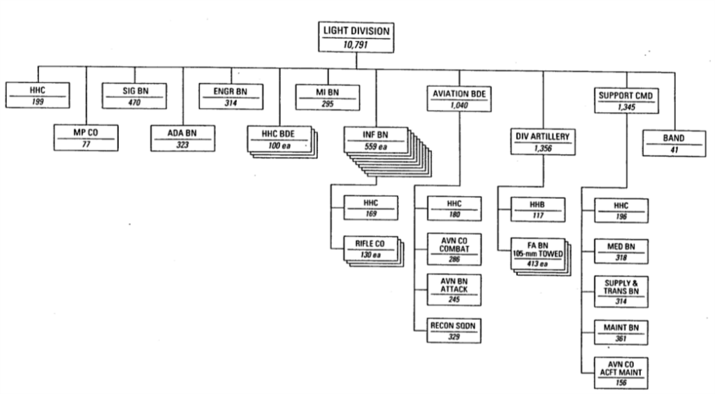Designing standardized light divisions proved more difficult, because there wasn’t a perceived requirement for limited contingencies under the Nixon Doctrine. Then the Soviets invaded Afghanistan and the Iran hostage crisis occurred, which created the perception that a flexible, rapidly deployable division was needed. The success of light forces in the Falklands War, the Lebanon War, and the invasion of Grenada proved their efficacy. Starry standardized infantry, airborne, and airmobile divisions into a light division concept that could be airlifted to fight “in contingency areas, such as the Asiatic rim” while still having the combat power to fight Soviet forces in Europe.