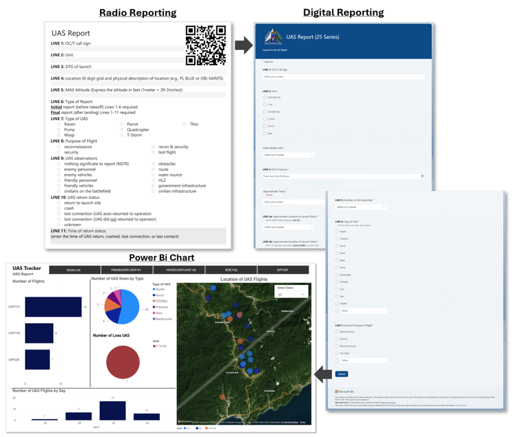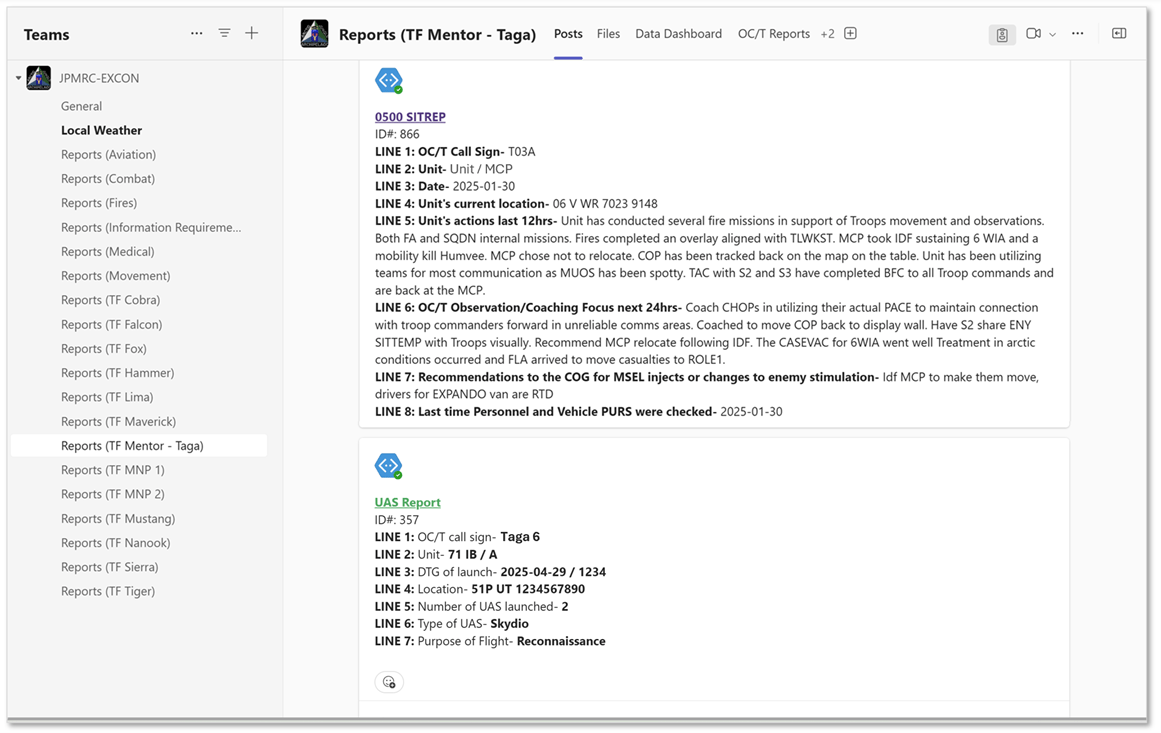 Using Microsoft Forms, OC/Ts can digitally submit situation reports, contact reports, unmanned aircraft system reports, fratricide reports, fire missions, etc. The existing OC/T data collection forms can be quickly digitized with links or QR codes that enable a fast and easy submission. To process the data in real time, our tool utilizes another Microsoft application, Power Automate. Reports submitted via Microsoft Forms are posted on various Microsoft Teams channels within seconds of submission and consolidated in a SharePoint list. This same data can also be automatically distributed via email based on the time sensitivity of the information and its purpose. To analyze the data the staff officer now only needs to utilize Power BI to create charts once and link data from the SharePoint List one time. Charts continue to update as new digital reports are submitted. This is performance data analysis, in real-time. Power BI allows users to display the information collected in a variety of ways, ensuring that performance data and training outcomes are easy to access and interpret and that they improve the efforts of the training unit. This quick visualization and analysis can eliminate the need for hours upon hours of staff work for units and streamline the visualization of the performance analysis of battalions and brigades in a CTC rotation.